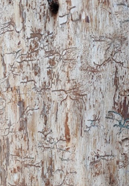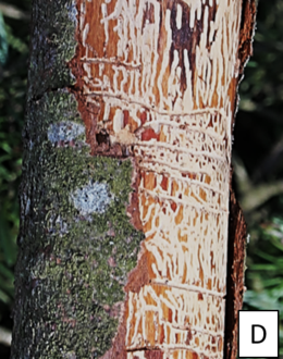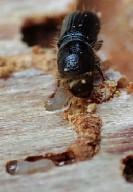Exemplarisch wurde aus dem Main-Tauber-Kreis im Norden Baden-Württembergs im Spätsommer 2022 von intensivem Käferbefall an Küstentanne und Douglasie auf mehreren Hektaren berichtet. Wie bei der Weißtanne verfärbten sich die Kronen über den Winterverlauf zunehmend rot. Die Forstliche Versuchs- und Forschungsanstalt Baden-Württemberg (FVA) konnte den Westlichen Tannenborkenkäfer als maßgeblich schadverursachend nachweisen (Abb. 5). Neben der Trockenheit tragen Pilzbefall (Rußige Douglasienschütte, Phaeocryptopus gaeumannii) sowie die Douglasiengallmücke (Contarinia spp.) zur Vorschädigung von Douglasien bei. Stehendbefall samt Durchentwicklung und Ausbreitung ist zwar kein ganz neues Phänomen für diese Baumart in Südwestdeutschland. Bislang wurde zumeist jedoch von einem stark reduzierten Bruterfolg berichtet. In der Regel gelten die kleinen Borkenkäferarten wie Kupferstecher (Pityogenes chalcographus) und Furchenflügliger Fichtenborkenkäfer, welche den Astbereich bzw. Jung- und Stangenwuchs besiedeln, als schadrelevanter für die Douglasie.