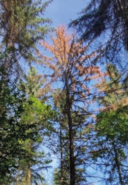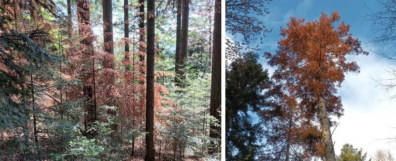 Die sich rot färbenden Weißtannen (Abies alba) machen es offensichtlich: der vergangene trocken-heiße Sommer hinterließ auch an der als relativ klimatolerant geltenden Baumart seine Spuren. Die geschwächten Tannen werden anschließend von Schadorganismen wie Borkenkäfern und Weißtannenrüsslern befallen, welche letztlich zum Absterben führen.