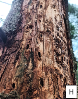 Abb. 6: Schadbilder an Weißtanne: A) starker Mistelbefall; B) Wucherungen nach Reifungs-/Überwinterungsfraß des Kleinen Tannenborkenkäfers, oftmals an Astunterseiten in der Schattkrone; C) Furchenflügliger Fichtenborkenkäfer (hier zusammen mit Mittlerem Tannenborkenkäfer); D) Mittlerer Tannenborkenkäfer an Astmaterial; E) Krummzähniger oder Westlicher Tannenborkenkäfer; F) Larven zur Verpuppung im Splint; die mit hellem Bohrmehl verstopften Gänge zeigen an, dass sich die Brut noch im Stamm befindet; G) Larve des Weißtannenrüsslers, ca. 1 cm lang; H) zu spät! Altbefall durch Weißtannenrüssler; Larvengänge bis 50 cm lang; I) Hallimasch an bereits abgestorbener Tannenverjüngung