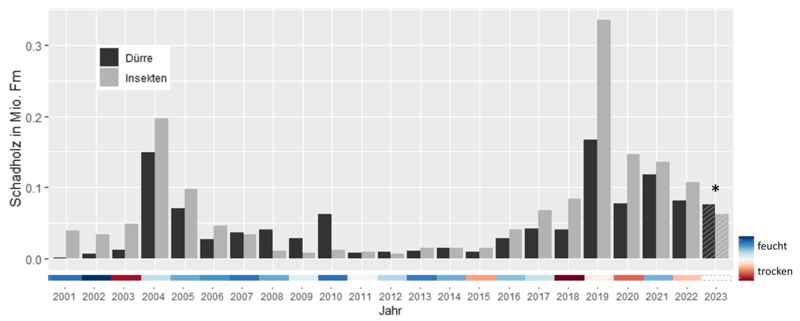 Abb. 2: Schadholzmengen in Millionen Festmeter an Weißtanne in Baden-Württemberg seit 2001 (Sternchen = Daten für 2023 noch unvollständig, Stand: 12.06.2023, Quelle: LFV, ForstBW); farbig dargestellt ist der mittlere landesweite Trockenheitsindex SPEI für die Vegetationsperiode April-September (Quelle: DWD) (Grafik: FVA BW/Becker, Bachfischer)