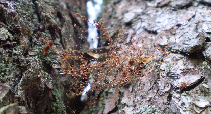 - Warten Sie möglichst nach Regenfällen einen Tag ab und suchen Sie erneut, dann sollte wieder frisches Bohrmehl zu sehen sein. Nach Regenfällen ist zwar auch Bohrmehl zu finden, aber nur sehr schwer!