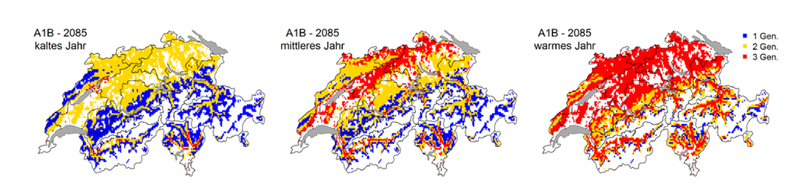 Die prognostizierte Anzahl Generationen hängt vom betrachteten Klimaszenario ab. Auch beim A2-Szenario, das von einer stetigen Emissionszunahme bis 2100 ausgeht, bleibt allerdings die Entwicklung einer vierten Generation bis Ende des Jahrhunderts unwahrscheinlich. Für alle Szenarien variiert der durchschnittliche Unterschied zwischen den betrachteten Zeiträumen in tiefen Lagen stärker als in höheren Lagen. Prognosen für tiefere Lagen sind also mit einer grösseren Unsicherheit behaftet.