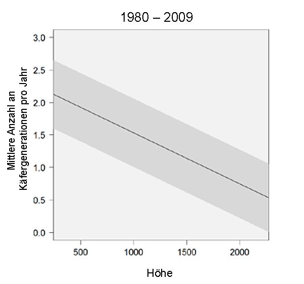 Die steigenden Temperaturen bewirken eine Zunahme der Anzahl Käfergenerationen, ein abnehmendes Frostrisiko und einen steigenden Trockenstress der Fichte. Eine im Modell simulierte Generationenzahl von beispielsweise 2.8 bedeutet, dass in 24 der simulierten 30 Jahre drei Generationen auftreten und in 6 Jahren nur zwei. Die zusätzlichen Käfergenerationen werden dazu führen, dass schneller eine kritische Populationsgrösse zur Besiedelung vitaler Bäume erreicht werden kann. Allerdings erhöht ein zu starker Populationsanstieg bei mangelnden Ressourcen die intraspezifische Konkurrenz, was wiederum das weitere Wachstum begrenzt.