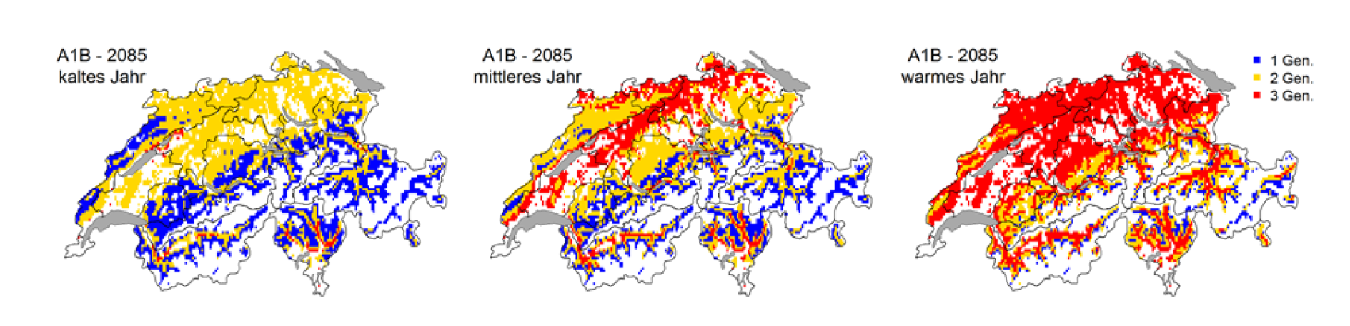 Die steigenden Temperaturen führen dazu, dass künftig mehr Generationen ausgebildet werden können als heute. Dies ist einerseits bedingt durch den früher im Jahr beginnenden Käferflug und anderseits durch die erhöhte Entwicklungsgeschwindigkeit der Jugendstadien. Vergleicht man die heutige Generationsverteilung in einem warmen, mittleren und kühlen Jahr mit entsprechenden Jahren am Ende dieses Jahrhunderts (A1B-Szenario), erkennt man in weiten Teilen der Schweiz eine Zunahme der Anzahl Generationen (Abb. 4). Eine Situation wie im Hitzejahr 2003 dürfte dann in einem durchschnittlichen Jahr zu erwarten sein. Selbst in kalten Jahren könnten sich bis in die Voralpen zwei Generationen entwickeln und in sehr warmen Jahren müssten schweizweit mit Ausnahme der hohen Lagen des Jura und der Alpen drei Generationen erwartet werden.