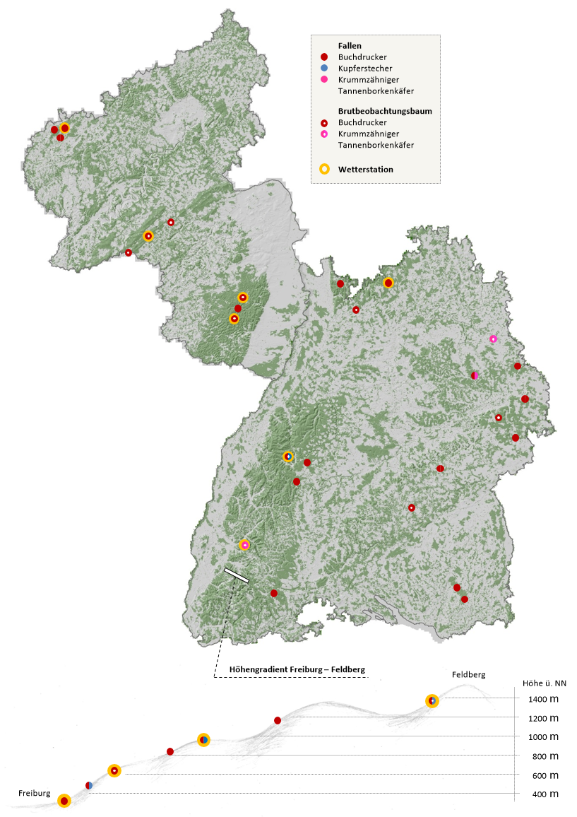 Die Monitoringstandorte wurden dabei so gewählt, dass sie die potentiell gefährdeten Wälder, verschiedene Höhenstufen sowie relevante Wuchsgebiete möglichst gut repräsentieren. Während der Höhengradient Freiburg-Feldberg (von ca. 300 Meter bis 1.400 Meter ü.NN) von Mitarbeitenden der FVA selbst betreut wird, übernehmen in den restlichen Landesteilen lokale Ansprechpartner*innen von ForstBW, zumeist Revierleitende oder Ausbildungsstellen, und vom Nationalpark Schwarzwald die wöchentliche Datenaufnahme nach einheitlichen Standards. Die Erstellung des methodischen Konzeptes, die Koordination der Umsetzung sowie die Zusammenführung und letztlich Interpretation der Daten obliegt der FVA als hoheitliche Instanz für den Waldschutz in Baden-Württemberg.