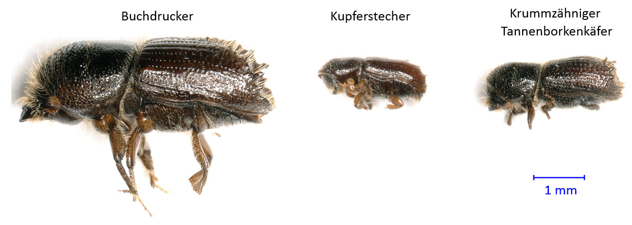 Ab 2021 hat sich das Monitoringnetz sowohl in Baden-Württemberg wie auch Rheinland-Pfalz gegenüber den Vorjahren auf aktuell 34 Standorte deutlich erweitert (Abb. 1). Es umfasst neben den Fichtenborkenkäfern Buchdrucker (Ips typographus) und Kupferstecher (Pityogenes chalcographus) nun auch den Krummzähnigen Tannenborkenkäfer (Pityokteines curvidens), einen wesentlichen Schadfaktor an Weißtanne (Abb.2).