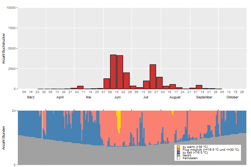 Abb. 4: Darstellung von Schwärmaktivität (oben) und schwärmrelevanten Temperaturen (unten) für den Buchdrucker an einem Beispielstandort im Odenwald, 349 m ü.NN im Jahr 2021. Deutlich erkennbar sind die 2 Schwärmwellen zur Anlage der Generationen F1 und F2. Der Hauptschwärmbeginn erfolgte witterungsbedingt erst Anfang Juni; ab Mitte August schwärmten trotz weiterhin günstiger Temperaturen kaum noch Käfer.