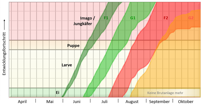 Abb. 6: Simulierte Entwicklung des Buchdrucker im Phänologiemodell PHENIPS [3] an einem Beispielstandort auf der Schwäbischen Alb, 734 m ü.NN im Jahr 2021 (Grafik angepasst aus PHENIPS online (BOKU Wien, Link). Die Darstellung zeigt den frühestmöglichen Befallsbeginn und die Anlage der ersten Generation (F1) Ende Mai, deren Entwicklungsfortschritt in besonntem bzw. beschattetem Szenario (linke bzw. rechte dunkelgrüne Linie) und Ausflug ab Mitte Juli. Analog ist die zweite Generation (F2) dargestellt, sowie die jeweiligen Geschwisterbruten (G1, G2); eine dritte Generation wurde nicht mehr angelegt.