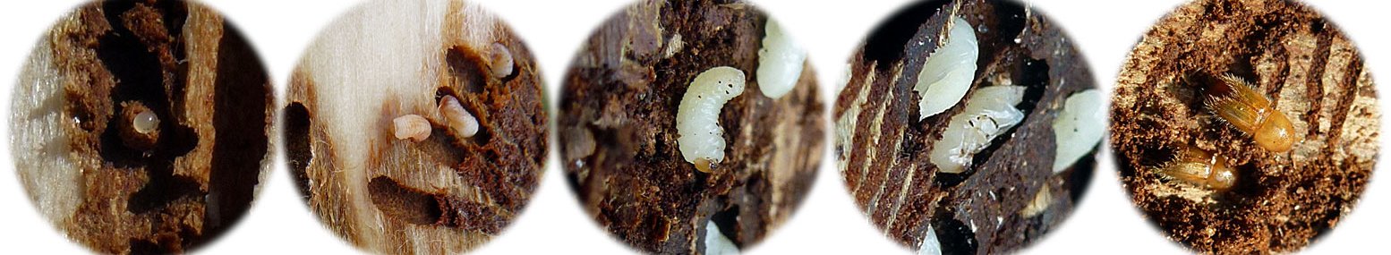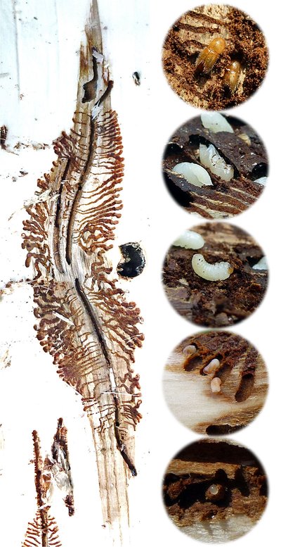 Die Brutentwicklung wird beispielgebend für die zwei Arten Buchdrucker und Krummzähniger Tannenborkenkäfer überwacht. Für das Brutbaum-Monitoring werden geeignete Wirts-bäume ausgelegt und für eine kurze Zeit mit einem artspezifischen Pheromon beködert, was eine rasche Besiedlung sicherstellt. Anschließend wird anhand von abgehobenen Rindenfenstern der Entwicklungsfortschritt der angelegten Bruten unter der Rinde wöchentlich dokumentiert (Abb. 5). Um den Ausflug der fertig entwickelten Käfer zu verhindern, werden Brutbäume im Wirtschaftswald im frühen Jungkäferstadium entrindet und damit rechtzeitig unschädlich gemacht. Details zur Methodik sind in [1] ausführlich beschrieben.