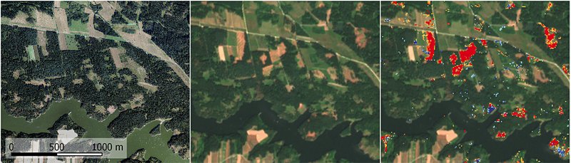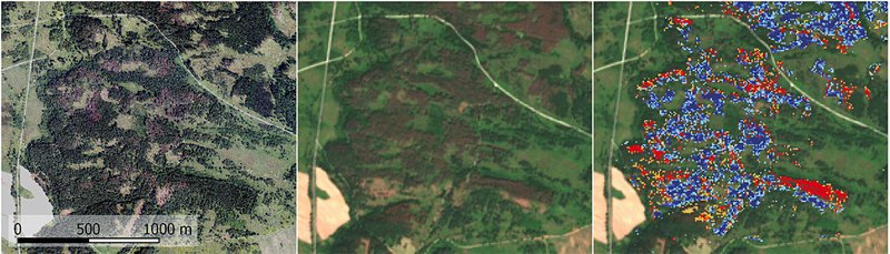 Abbildung 2a: Im Orthophoto aus 2018 (links) ist die dramatische Borkenkäfersituation am Truppenübungsplatz Allentsteig anhand brauner Kronen deutlich zu erkennen. Im Satellitenbild von Ende Juli 2019 (Mitte) haben die Schäden schon beinahe die gesamte Fläche erfasst. Rechts sieht man in blau die Schäden zwischen Oktober 2017 und September 2018 und in rot die aktuell (Oktober 2018 bis Juli 2019) hinzugekommenen Schadflächen