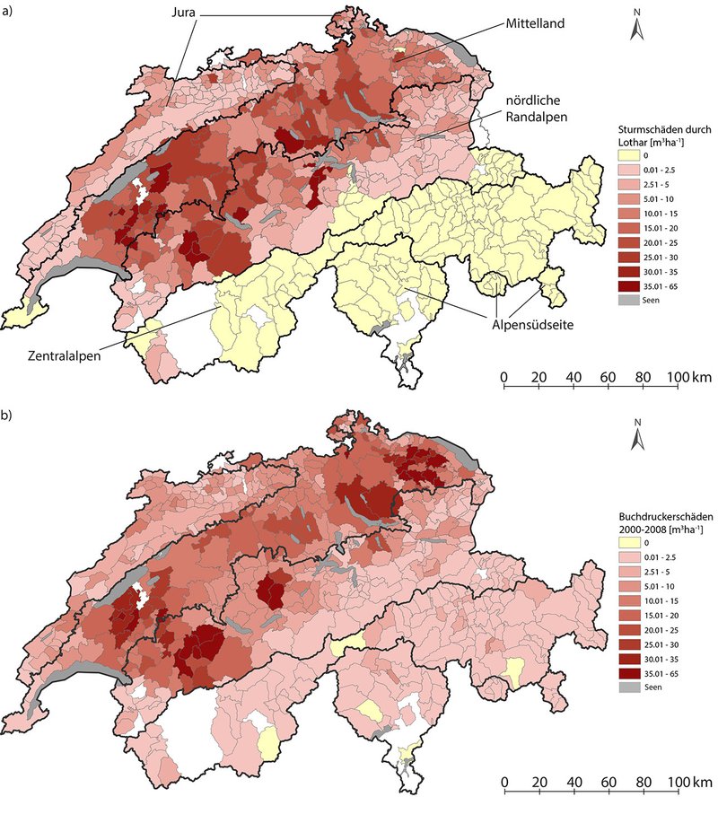Lothar wütete insbesondere im Mittelland und in den westlichen und zentralen Voralpen. Rund 8 Mio. m3 Fichtenholz Fielen ihm zum Opfer. In der Folge vermehrte sich der Buchdrucker vor allem in Regionen mit starken Sturmschäden, wodurch nochmals dieselbe Menge Fichten befallen und abgetötet wurde. Je grösser ein Sturmschaden ausgefallen war, desto grösser war der Folgeschaden (Abb. 3).