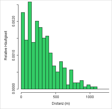 Abb. 6 - Histogramm der Distanz zwischen neuen Befallsherden im Jahr 2002 und Vorjahresschäden im Napfgebiet. Mit zunehmender Distanz zum nächsten Befallsherd nimmt der Anteil neuer Käfernester ab.