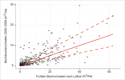 Abb. 3 - Zusammenhang zwischen Lothar-Sturmschäden und Buchdrucker-Befall in den Jahren 2000–2002. Rote Linien: Vorhersage und Streuungsbereich (gestrichelt) einer Quantilregression.