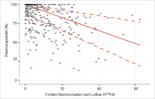 Abb. 4 - Zusammenhang zwischen Lothar-Sturmschäden und Räumungsanteil bis September 2000. Rote Linien: Vorhersage und Streuungsbereich (gestrichelt) einer Quantilregression.