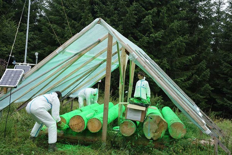 In den Jahren 2015 bis 2017 wurden Stammstücke von heimischen Fichten im Versuchsgebiet im Nationalpark Schwarzwald als Brutbäume ausgelegt und eine Besiedlung mit Buchdruckern über Lockstoffe verstärkt. Daraufhin wurde die Rindenoberfläche aller Stämme vor dem Ausfliegen der Jungkäfer mit fluoreszierendem Farbpulver eingefärbt (Abb. 1). Beim Ausbohren aus der Rinde markierten sich die Käfer mit den aufgetragenen Farbpigmenten passiv und waren daraufhin in den rund sechzig weiträumig verteilten Lockstofffallen, mit denen sie gefangen wurden, wieder zu identifizieren (Abb. 2).