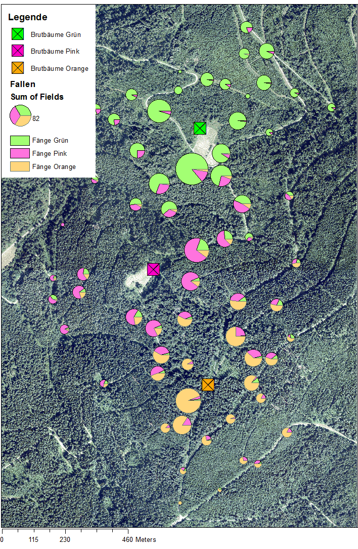 Um räumliche oder strukturelle Präferenzen des Buchdruckers erkennen zu können, wurden bei jeder dieser Fallen entsprechende Daten über Gelände- und Bestandesstrukturen erhoben. Anhand dieser Parameter und den täglichen Fängen lassen sich Rückschlüsse auf die Ausbreitungsdynamik, Flugdistanzen und die räumlichen Präferenzen der Käfer ziehen. In einer nachfolgenden Einzelkäferanalyse im Labor wurden Geschlecht und Alter (Jung- oder Altkäfer) der Tiere bestimmt, um Unterschiede im Ausbreitungsverhalten feststellen zu können.