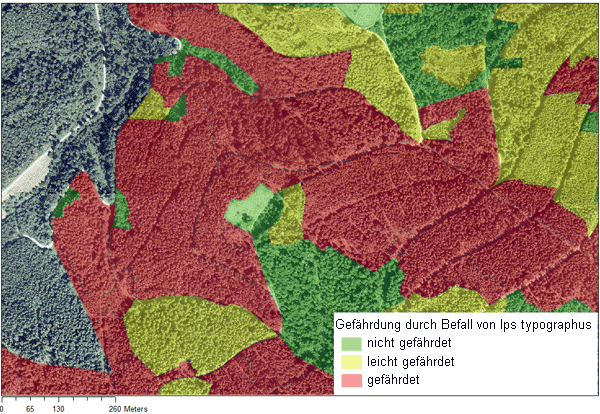 Abb. 4: Beispielhafte Karte zur unterschiedlichen Gefährdung von Bestandesstrukturen durch den Befall des Buchdruckers.