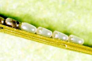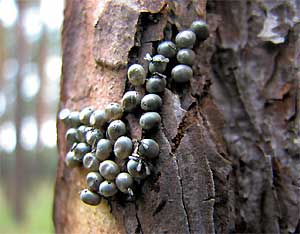 Die geschlüpften Erzwespen, nur ca. 0,5 mm groß, wurden als Trichogramma evanescens bestimmt. Diese Art ist als effektiver Gegenspieler des Kiefernspanners bekannt, parasitiert aber auch Eier der Forleule sowie zahlreicher anderer Insektenarten.
