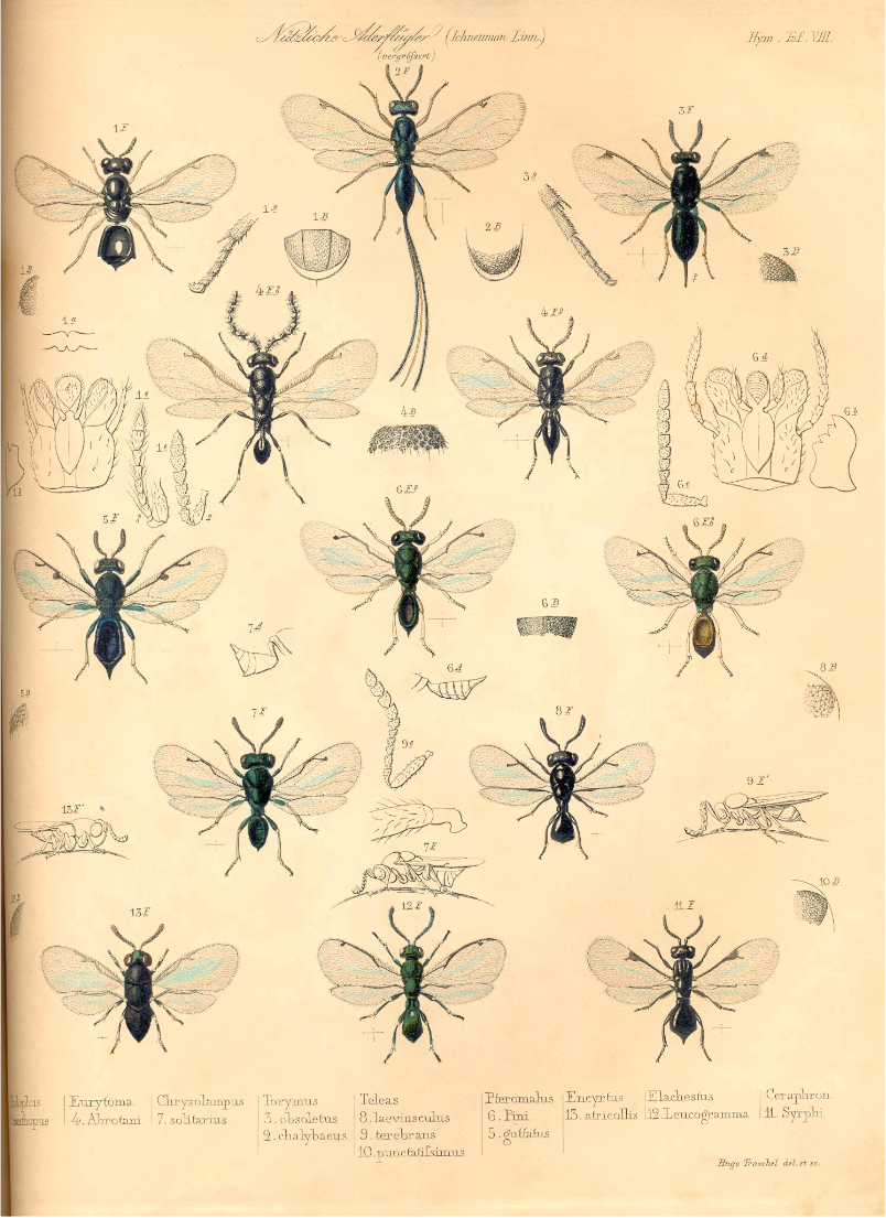 Es gilt auch in Zukunft, die von Ratzeburg (1844) als "mächtige Alliirte der Forstbedienten“ (Abb. 4) bezeichneten Parasitoide einerseits bei der Bewertung einer Bestandesgefährdung zu berücksichtigen, andererseits intensiv zu fördern. Bei angezeigter Bestandesgefährdung muss die Überwachung der Vitalität der Schädlingspopulationen mit artspezifischen Methoden bis kurz vor dem Insektizideinsatz erfolgen, um den Einfluss von Gegenspielern oder ungünstiger Witterung registrieren zu können und die Entwicklung sowie Ausbreitung der natürlichen Gegenspieler nicht durch Insektizide negativ zu beeinflussen. Nicht bestandesgefährdende Fraßschäden sind zu dulden, um den Parasitoiden zeitlichen Vorlauf zu verschaffen. Bei Bestandesgefährdung sollten immer möglichst selektive Insektizide Verwendung finden, um natürliche Gegenspieler und Nebenwirte zu schonen. Erforderlich ist eine Verstärkung der Vor-Ort-Beratung durch Waldschutzspezialisten und die Schulung der Forstpraktiker, um den Einfluss natürlicher Gegenspieler zu erkennen.