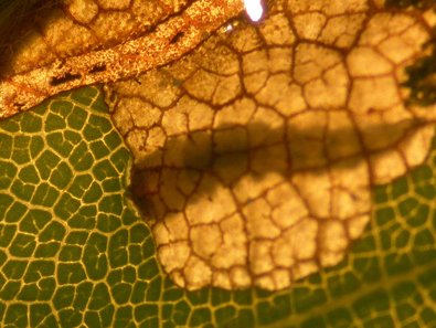 Abb. 2: Buchenblatt mit Lochfraß. Eine Mine geht von der Mittelrippe aus und verbreitert sich während des Wachstums der Larve; Kotspuren als Mittelstreifen.