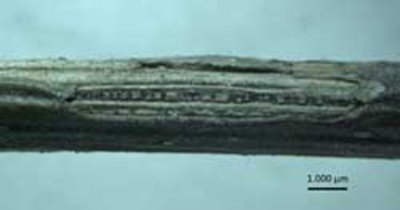 Abb. 5: Oberflächlich benagter Buchenzweig, wobei die Baststränge freigelegt wurden.