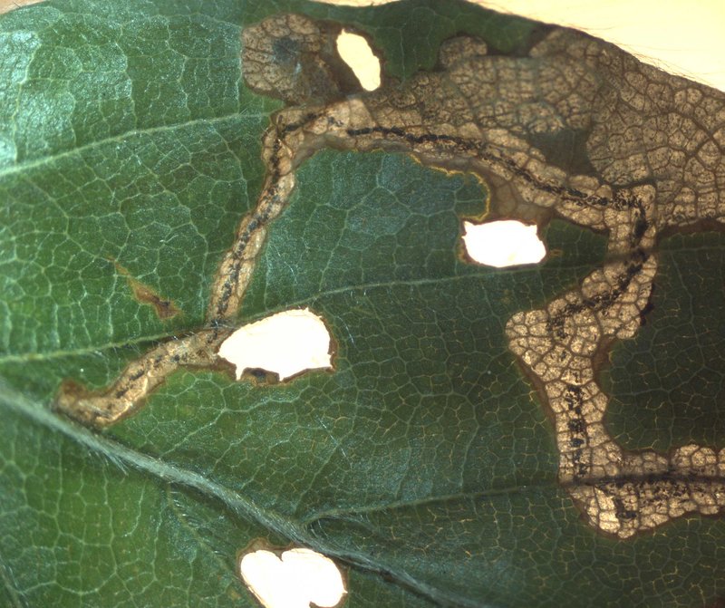 Die Eiablage erfolgt in verschiedenen Kronenteilen, wobei die Schattenkrone etwas bevorzugt wird. Ein Weibchen legt bis zu 35 Eier, jeweils in die Nähe der Mittelrippe. Von dort aus minieren die jungen Larven zunächst eine Gangmine, die sich im Lauf der Larvenentwicklung verbreitert (Abb. 2) und schließlich zur flächigen Platzmine wird (Abb. 3). Wenn Blattrippen betroffen sind, vergilben die Blätter teilweise oder sie welken ganz oder teilweise ab (Abb. 6).