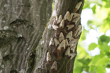 Abb. 1. Ein Schwammspinner-Weibchen bei der Eiablage. Der Falter bildet ein schwammartiges Gewebe, das ihm seinen Namen gegeben hat. Foto: Entomologie (WSL)
