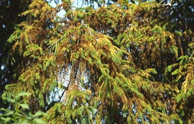 Auch bei der gewöhnlichen Fichte können gut sichtbar Nadelverfärbungen und anschliessend ein erheblicher Nadelverlust entstehen .