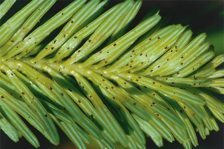 Von der Laus "angezapfte" Nadeln zeigen anfangs eine gelbe Bänderung.