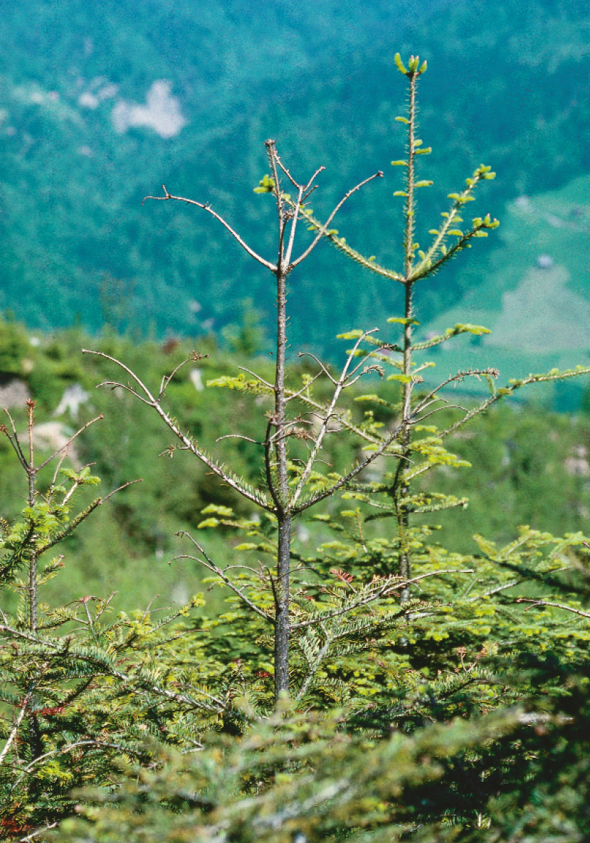 - Überlebensfähige Tannen mit mehr oder weniger intakten Gipfeltrieben bei einem ersten Eingriff nicht zu stark frei stellen; dies würde sie noch anfälliger machen.