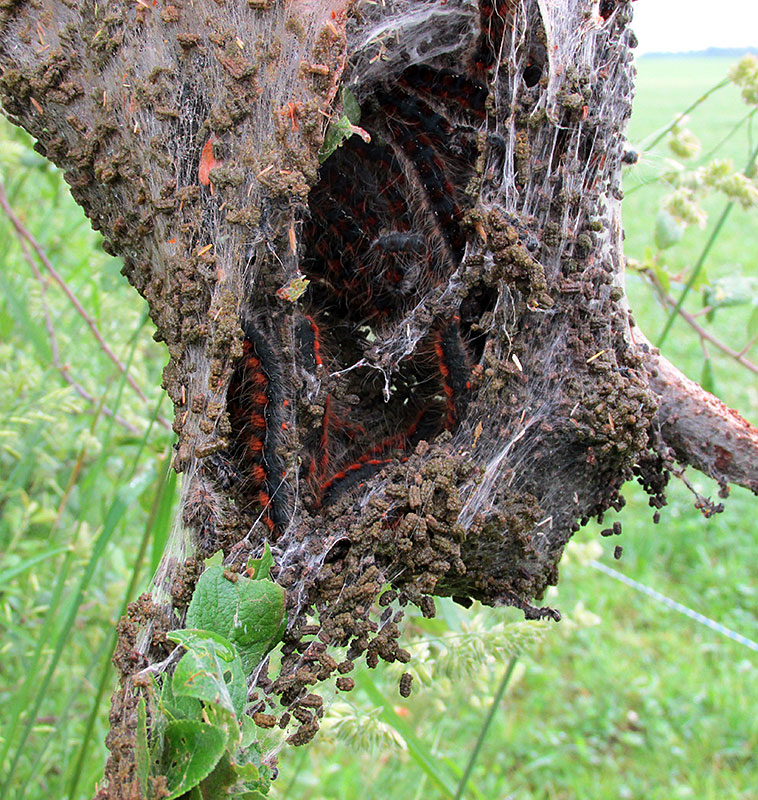 Die Eiablage erfolgt Mitte März bis Anfang April spiralig an Zweigen der befallenen Bäume und Sträucher. Bevorzugt werden Linde, Birke, Weißdorn, Schlehe aber auch Weiden und Rosengewächse. Über die Eier verteilen die Weibchen ihre buschige Afterwolle, um das Eigelege zu tarnen und zu schützen. Anfang bis Mitte April schlüpfen dann die kleinen Raupen und sammeln sich in sehr auffälligen, sackartigen Raupengespinsten. Diese befinden sich meist an der Spitze der Zweige. Die Gespinste können eine beträchtliche Größe annehmen, weshalb sich die Zweige durch das Gewicht nach unten biegen.