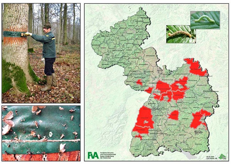 Abb. 3: Untere Forstbehörden mit dauerhaftem Frostspanner-Monitoring in Südwestdeutschland (rot), wo Leimringkontrollen stattfinden (oben links: Bestreichen des Ringes mit Leim; unten links: auf dem Leimring klebende männliche Falter und flügellose Weibchen) (aus Delb 2008).