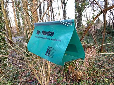 Mit Lockstoff beköderte Pheromonfallen finden in verschiedenen Ausführungen beim Falter-Monitoring des Schwammspinners (Lymantria dispar) und des Eichenprozessionsspinners (kurz: EPS) (Thaumetopoea processionea) Anwendung. Die häufigsten Fallen sind hier dreieckige Deltafallen (Abb. 1) sowie Trichterfallen, die von verschiedenen Herstellern angeboten werden. Die Anzahl der gefangenen männlichen Falter gibt Aufschluss über deren Schwärmaktivität.