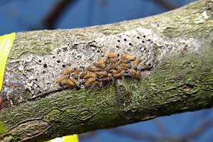 - mehr als 50 Eiraupen je 100 Knospen führen zu Kahlfraß in der gesamten Krone.