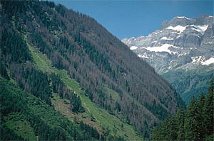 Abb. 1 - Grösste zusammenhängende Buchdrucker-Befallsfläche der Schweiz nach dem Sturm "Vivian" am Gandberg (Kanton Glarus). Foto: Beat Forster (WSL)