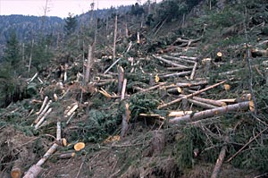Abb. 3 - Das Aufräumen von Sturmschadenflächen ist mit grossem Aufwand verbunden und oft sehr gefährlich. Foto: Walter Schönenberger (WSL)