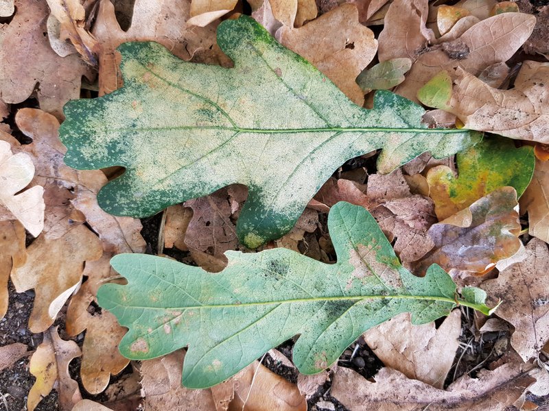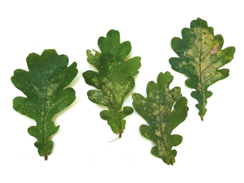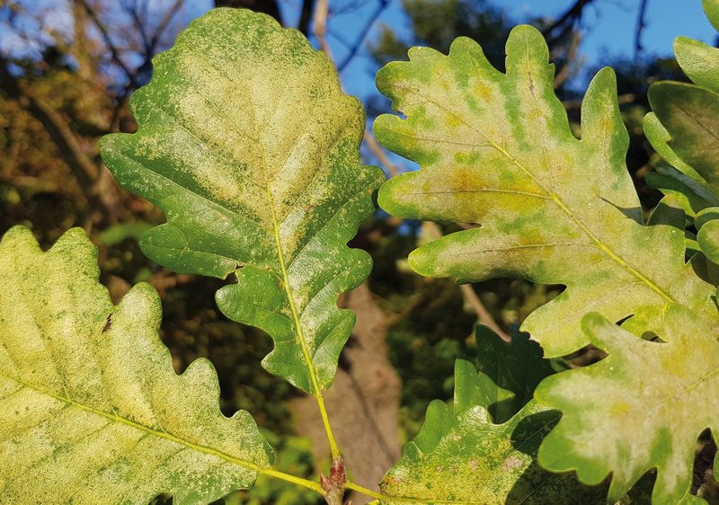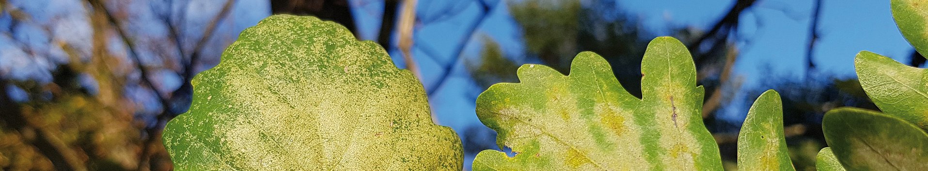 Ein sehr starker bis vollständiger Befall von Bäumen lässt vermuten, dass die Eichennetzwanze zumindest seit dem Vorjahr in diesem Gebiet auftritt. Geringe Befallsintensität (insbesondere bei der durchschnittlichen Vergilbung je Blatt) könnte auf eine kürzere Besiedlung des Baumes deuten. Durch C. arcuata hervorgerufene Symptome können anderen Blattsymptomen, wie beispielsweise durch Eichenmehltau verursacht, bei einer eher gräulichen Blattverfärbung sehr ähneln (Abb. 5). Die alleinige Ansprache mittels Feldstecher ist daher nur auf kürzeste Distanz möglich und wird für eine Präsenzfeststellung als unzureichend beurteilt.