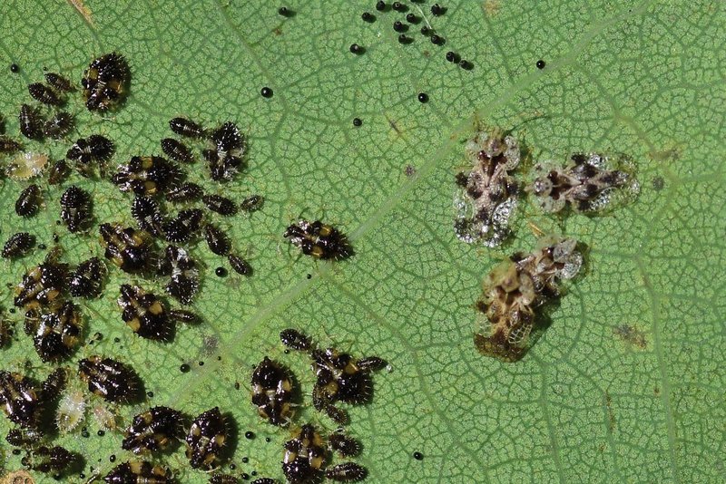 Abb. 2: C. arcuata, Adulte (rechts), Nymphen (links), Eilager (oben) sowie Kottröpfchen auf der Unterseite eines Eichenblattes. Foto: Markus Sallmannshofer © BFW