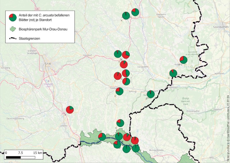 Abb. 3: Untersuchte Standorte mit Auftreten von C. arcuata und Befallsintensität als Anteil der befallenen Blätter an der gesamten Blattmasse (Tortendiagramme). Die grün hervorgehobene Fläche zeigt das Gebiet des Biosphärenparks Mur-Drau-Donau. © BFW