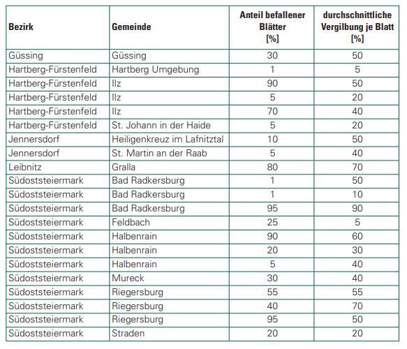 Tab. 1: Vorkommen von C. arcuata in fünf südlichen Bezirken der Steiermark und des Burgenlandes, mit Angabe der Gemeinde, Befallsintensität und mittlerer Vergilbung. © BFW