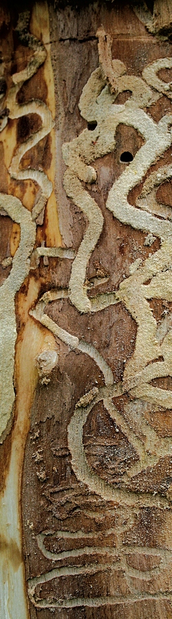 Abbildung 3: Typische Fraßgänge der Larven des Asiatischen Eschenprachtkäfers und D-förmige Ausbohrlöcher der Käfer. Bild: Troy Kimoto, Canadian Food Inspection Agency, bugwood.org