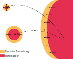 Die Ausbreitung des EAB findet wie meist bei invasiven Schadorganismen auf zwei Arten statt. Die lokale Ausbreitung erfolgt hauptsächlich aktiv, das heißt durch fliegende Käfer, und erstreckt sich auf einen Bereich von wenigen hundert Metern. Darüber hinaus kommt es zu einer vom Menschen unterstützten Fernverbreitung mittels Pflanzgut, Holz (besonders Brennholz ist bedeutend) oder Astschnittmaterial. Solcherart verbreitete Käfer können Satellitenpopulationen außerhalb des bisherigen Befallsgebietes begründen, die sich dann durch aktive Käferverbreitung ausdehnen (Abbildung 2).