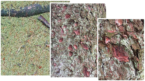 Abb. 8: Neben schütteren Kronen mit fahlgrünen Nadeln finden sich am Boden grüne Nadelteppiche (links); daneben Spechtabschläge an der Rinde ggf. auch mit Borkenkäfereinbohrloch. Fotos: M. Niesar
