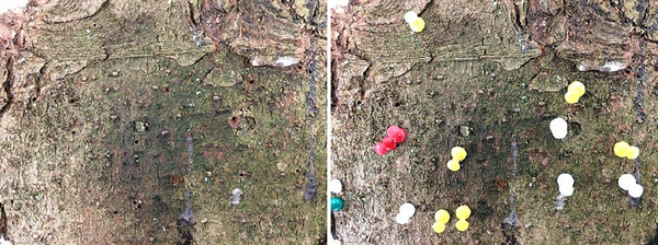 Abb. 9: Borkenkäferlöcher, rechts mit Markierungen (in dieser Jahreszeit quasi ohne Bohrmehl). Fotos: M. Niesar