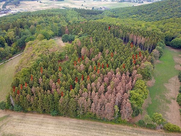 In erster Linie durch die außergewöhnlich hohen Temperaturen von April bis August 2018 und durch das zu beklagende sehr hohe Niederschlagsdefizit (in Deutschland ‑150 mm oder ‑40,6 % gegenüber dem langjährigen Mittel) haben sich landesweit in diesem Sommer bislang nicht vorgekommene Dichten von Borkenkäferpopulationen aufbauen können. Die Käfer hatten leichtes Spiel, da durch den Trockenstress die natürliche Abwehr der Fichten gegen diese Eindringlinge – die Harzproduktion – in diesem Jahr mehr oder weniger ausfiel. Erschwerend kam hinzu, dass in einigen Teilen des Landes das durch Winterstürme verfügbare bruttaugliche Holz im Frühjahr sehr schnell von diesen Rindenbrütern besiedelt werden konnte und vielerorts die Stürme angerissene und für den Käfer attraktive offene Waldränder hinterließen.