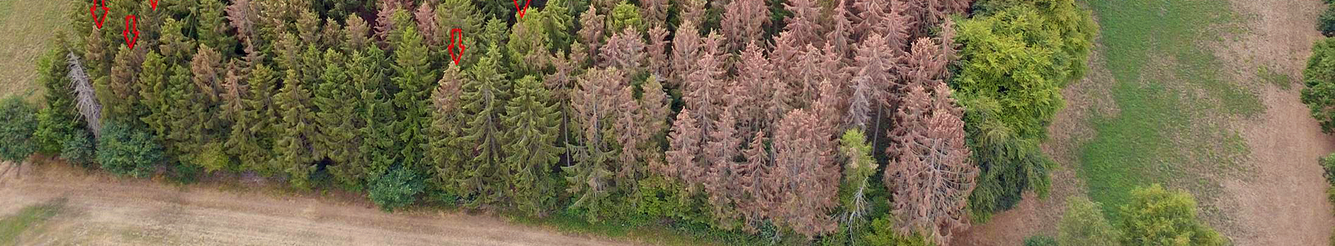 Abb. 7: Aus der Vogelperspektive: braune, derzeit aber unbedenkliche Kronen. Sehr viele Fichten mit grünen oder fahlgrünen Kronen (rote Pfeile) sind aber massiv von Borkenkäfern befallen. Sier überwintern in den Bäumen um in nächsten Frühjahr sehr zeitig gesunde Fichten zu attackieren. Fotos: M. Nolden