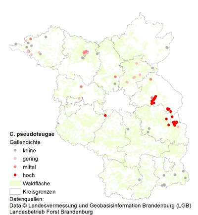 Am Landeskompetenzzentrum Forst Eberswalde (LFE) wurden 103 Zweigproben, die im September 2016 in 31 brandenburgischen Forstrevieren entnommen wurden, untersucht. Von den drei in Nordamerika in Douglasiennadeln minierenden Gallmückenarten wurde an diesen Proben Contarinia cf. pseudotsugae nachgewiesen. Abbildung 4 zeigt neben der Verbreitung der Gallmücke in Brandenburg auch die Orte der Probenahme. Die Gallmücke wurde in 57 % der Proben, jedoch bisher nicht im Südteil Brandenburgs nachgewiesen. Gallen wurden über die gesamte Altersspanne der untersuchten Douglasien (hauptsächlich 3 - 35 Jahre, maximal 61 Jahre) gefunden.