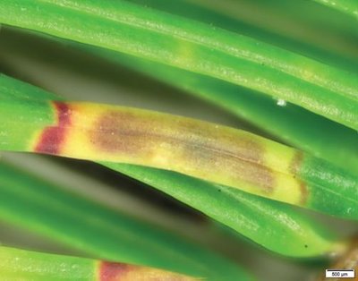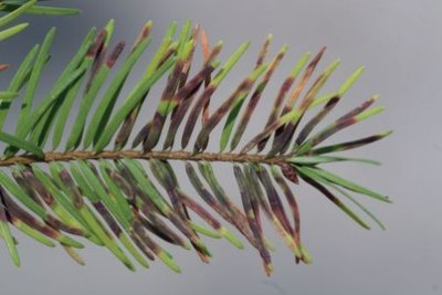 Die Gallbildungen führen zu einer Verfärbung und meist leichten Deformation des jüngsten Nadeljahrgangs und teilweise zum vorzeitigen Abfallen der betroffenen Nadeln (Abb. 2-3; Simko, 1982; De Angelis, 1994; Hagle et al., 2003). In Nordamerika starben nach mehrjähriger Gallmückenbesiedlung Zweige zurück, ganze Pflanzen starben jedoch nicht ab (Condrashoff, 1962; Hagle et al., 2003). Die verursachten Schäden führten insbesondere in Weihnachtsbaumkulturen zu wirtschaftlichen Verlusten (Simko, 1982; Hagle et al., 2003; Bulaon, 2005).