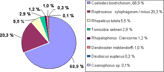 Auf diese Weise wurde die Anwesenheit folgender Borkenkäferparasitoide im Nationalpark Bayerischer Wald festgestellt: Die am häufigsten gefundene Parasitoidenart ist Coeloides bostrichorum, eine Brackwespe, die als häufiger, wichtiger Borkenkäferfeind bekannt ist. Sie sticht mit ihrem langen Legestachel durch die Rinde und betäubt die Wirtslarve, bevor sie ihr Ei auf sie legt. Bis zu ihrer eigenen Verpuppung lebt die Wespenlarve endoparasitisch vom Körper des Wirtes. Die Larve der als Borkenkäferfeind bekannten Erzwespe Roptrocerus xylophagorum lebt ektoparasitisch an Borkenkäferlarven. Das Weibchen dieser Art dringt selbst durch die Einbohrlöcher der Käfer in die Brutsysteme ein, um ihre Eier abzulegen. Auch Rhopalicus tutela ist ein häufiger und wichtiger Larvenparasit. Tomicobia seitneri sticht nicht Larven, sondern erwachsene Käfer zur Eiablage an (Imaginalparasit). Sie ist in ihrer Wirksamkeit schwieriger zu beurteilen als die bisher genannten, da die Käferweibchen trotz Parasitierung noch einen großen Teil ihrer Eier ablegen können. Die Verteilung des Artenspektrums zeigt Abbildung 2.