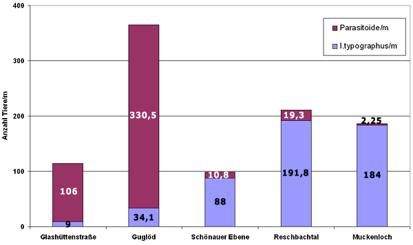 Das über die gesamte Fläche gemittelte Parasitierungsprozent ist mit 76 % sehr hoch. Es variiert stark, je nachdem, ob der Ursprung der beprobten Stämme im Kerngebiet oder im Waldschutzgürtel des Nationalparks lag. An einzelnen Waldorten wurde fast die gesamte Buchdruckerbrut durch Parasitoide vernichtet. So betrug z. B. an zwei Waldorten im Kerngebiet (Guglöd, Glashüttenstraße) das Parasitierungsprozent 90,6 bzw. 92,2 %, wogegen im Waldschutzgürtel (Reschbachtal 9,1 %, Schönauer Ebene 9,1 % und Muckenloch 1,2 %) nur geringfügige Parasitierungsgrade ermittelt werden konnten. Die durchschnittliche Zahl der geschlüpften Buchdrucker zu Parasitoiden (pro 1 Meter Stammstück) zeigt die Abbildung 4. In Guglöd vernichteten Coeloides bostrichorum und Roptrocerus sp. Rhopalicus tutela den Großteil der Käferbrut. Tomicobia seitneri und Dendrosoter middendorffi waren dort minimal vorhanden. Am Waldort Glashüttenstrasse hingegen war nur Rhopalicus tutela als Parasitoid wirksam.